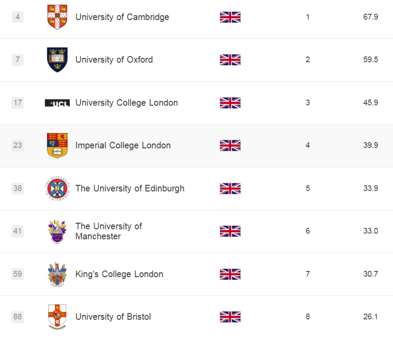 除此之外,全球前100里還有倫敦大學(xué)學(xué)院(17)、帝國理工學(xué)院(23)、愛丁堡大學(xué)(38)、曼徹斯特大學(xué)(41)、倫敦國王學(xué)院(57)以及布里斯托爾大學(xué)(87)。
