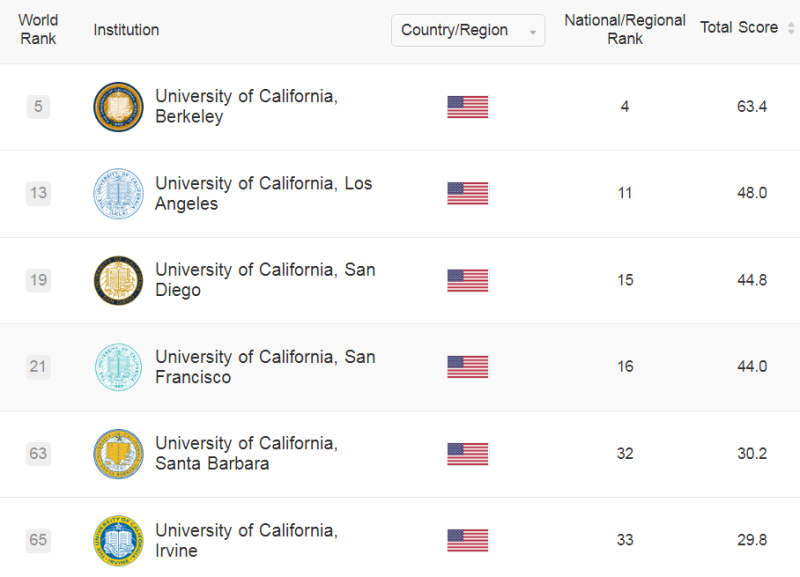 值得一提的是,UC系大學(xué)的表現(xiàn)尤其突出,10所UC分校有6所闖進(jìn)前100名,它們是: