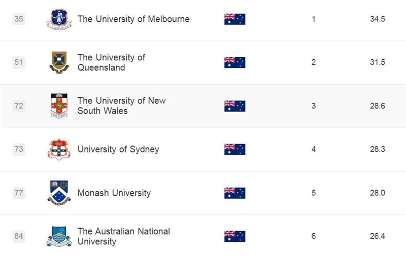 其中成績最 好的是墨爾本大學(xué)(35),而后是昆士蘭大學(xué)(50)、新南威爾士大學(xué)(71)、悉尼大學(xué)(72)、莫納什大學(xué)(76),以及澳洲國立(83)和西澳大利亞大學(xué)(99)。