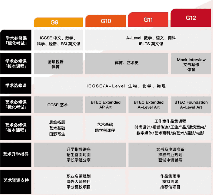 學校在高中學段(G9- G12)開設國際藝術課程,旨在為有藝術天賦和特長的學生提供完備專業的藝術升學路徑,全面培養學生綜合學術能力、審美感知、藝術表現、創意實踐,進而無縫銜接世界一流藝術類高等學府。