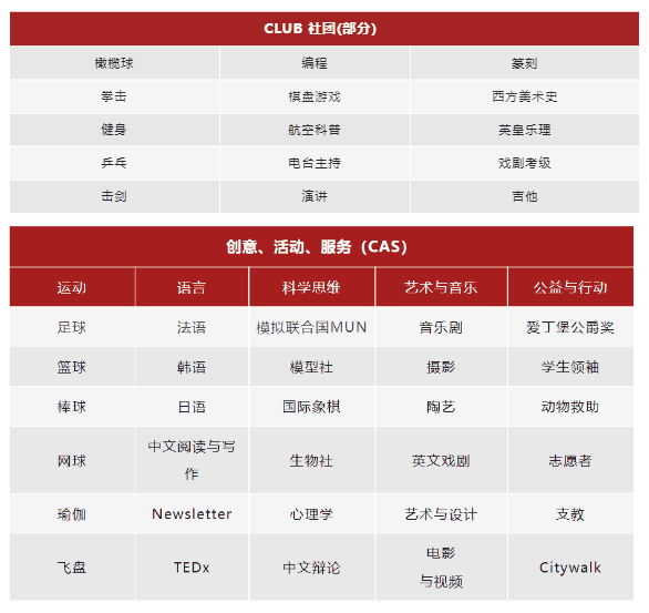 50余門CAS(創(chuàng)意、活動(dòng)、服務(wù))拓展課程及學(xué)生社團(tuán),涉及體育運(yùn)動(dòng)、藝術(shù)設(shè)計(jì)、音樂、科學(xué)、外語、影視戲劇、公益等類目。